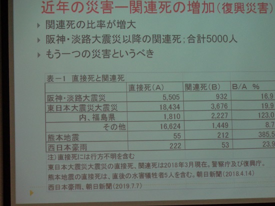 講義は災害、防災・減災、避難、避難しない人である在宅被災者、仮住まい、仮設住宅、恒久住宅の確保、復興のまちづくりなどについて、災害例を挙げながら自治体のあるべき姿をのべられた。