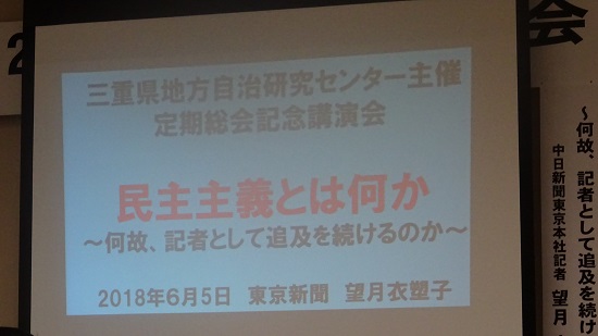議会が休会でしたので5日(火)の午後、三重県地方自治研究センターで行われ講演会に行きました。「民主主義とは何か?何故、記者として追及を続けるのか」という演題で、菅官房長官を問い詰める記者として知られている中日新聞東京本社記者である望月衣塑子さんが話しをされました。質問を入れて約2時間30分マシンガンのように休みなくはや口であるがよくわかる内容でした。