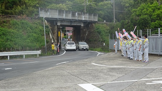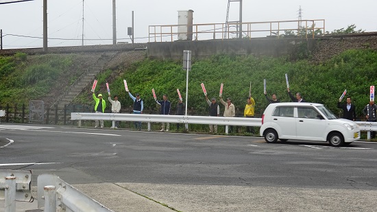 この活動は昨年もおこなわれており、交通安全への意識の高さの反映といえます。さらに、警察、交通安全協会、役場の参加があり自主的な活動として大きく評価されるものです。途中で雨が降り出しましたので最後までできませんでしたが、この活動の意義はしっかりと理解されていると思います。