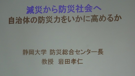 二日目は、「大規模災害への備え−防災・危機管理行政の役割を考える」という選科に参加しました。講師は静岡大学教授で防災総合センター長である岩田孝仁さんでした。結論を先に言えば、自治体の防災力をいかに高めるかでした。
