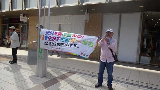 20日午後3時から行われた「憲法9条改悪NO」を求める街頭活動に参加しました。40人余りの参加者で「憲法改正はいや」「森友・加計は終わっていない」「公文書解散NO」などのプラカードを掲げ、ビラの配布や署名の呼びかけ、参加者のマイクでの訴えなどが行われました。訴えの途中で歌声も入り、和やかな活動風景でした。