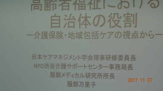 自らもケアマネジャーであり、看護師・社会福祉士・介護支援専門員として高齢者医療看護福祉のコンサルティング事業を立ち上げておられる東京医科歯科大学非常勤講師の服部万里子さんの話しを聞きました。肩書どおり現場を知っておられますので、講義の内容は具体的でした。平成30年の医療保険・介護保険制度改正と自治体の役割、地域包括ケアの現状と自治体の役割、新総合事業の現状と自治体の課題、認知症の国の方針と地域で支える自治体の役割、人材不足と自治体の役割という項目に分けて話されたわけですが、介護保険制度改正、新総合事業、認知症についてを報告します。