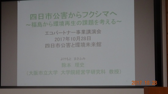 今日の午後、「脱原発」を考える市民講座に参加しました。講座の内容は「四日市公害からフクシマへ?福島から環境再生の課題を考える」で、大阪市立大学教授である除本理史さんの話を聞きました。